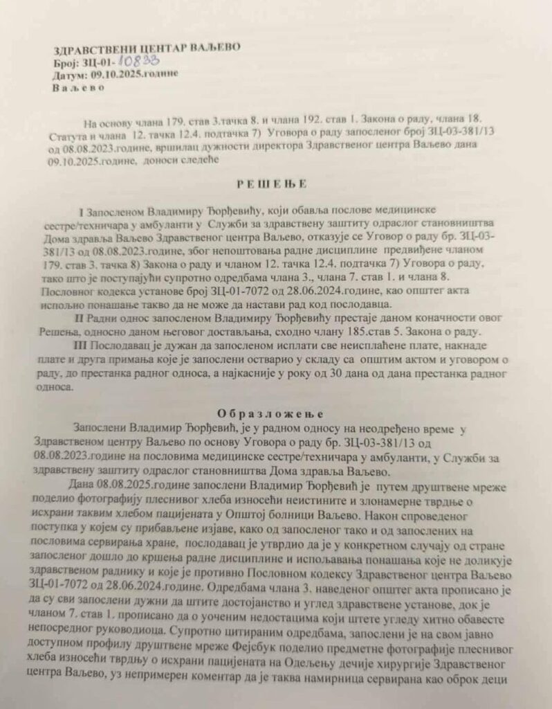 “Zaposleni Vladimir Đorđević je 8.08. 2025. godine podelio fotografiju plesnivog hleba iznoseći zlonamerne tvrde o ishrani takvim hlebom pacijenata u Opštoj bolnici u Valjevu”, piše između ostalog u obrazloženju odluke o otkazu.