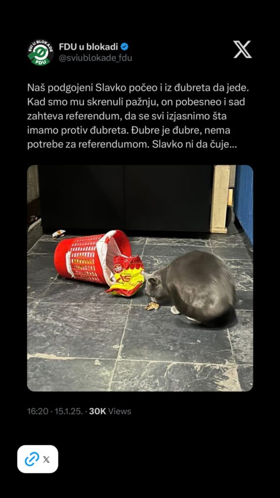 „Naš podgojeni Slavko počeo i iz đubreta da jede. Kad smo mu skrenuli pažnju, on pobesneo i sad zahteva referendum, da se svi izjasnimo šta imamo protiv đubreta. Đubre je đubre, nema potrebe za referendumom. Slavko ni da čuje…“, naveli su studenti FDU u blokadi.