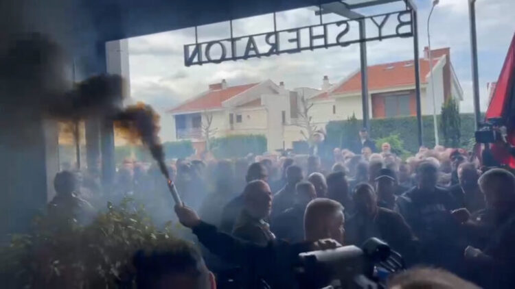 U jednom trenutku, okupljeni su zapalili i dimna sredstva, a ulaz u hotel koji je zbog njih bio blokiran, gotovo da se nije ni video zbog gustog crnog dima.