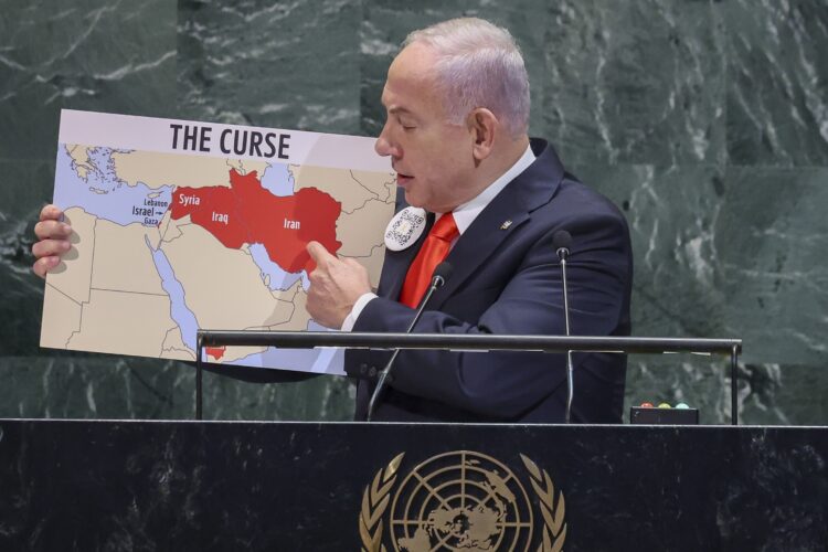 Kao što je to često činio i ranije, Netanjahu je podigao vizuelno pomagalo — mapu regiona pod nazivom „PROKLETSTVO“. Po njoj je crtao debelim markerom. Kasnije je na sako zakačio QR kod i podigao tablu sa pitanjima koje je pročitao publici.