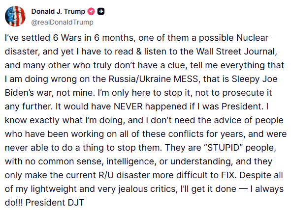 „Rešio sam 6 ratova u 6 meseci, od kojih je jedan mogao da preraste u nuklearnu katastrofu, a ipak moram da čitam i slušam kako Volstrit žurnal i mnogi drugi, koji zaista nemaju pojma, govore da sve što radim u vezi sa rusko/ukrajinskim haosom radim pogrešno“, napisao je Tramp u novoj objavi na društvenim mrežama.
