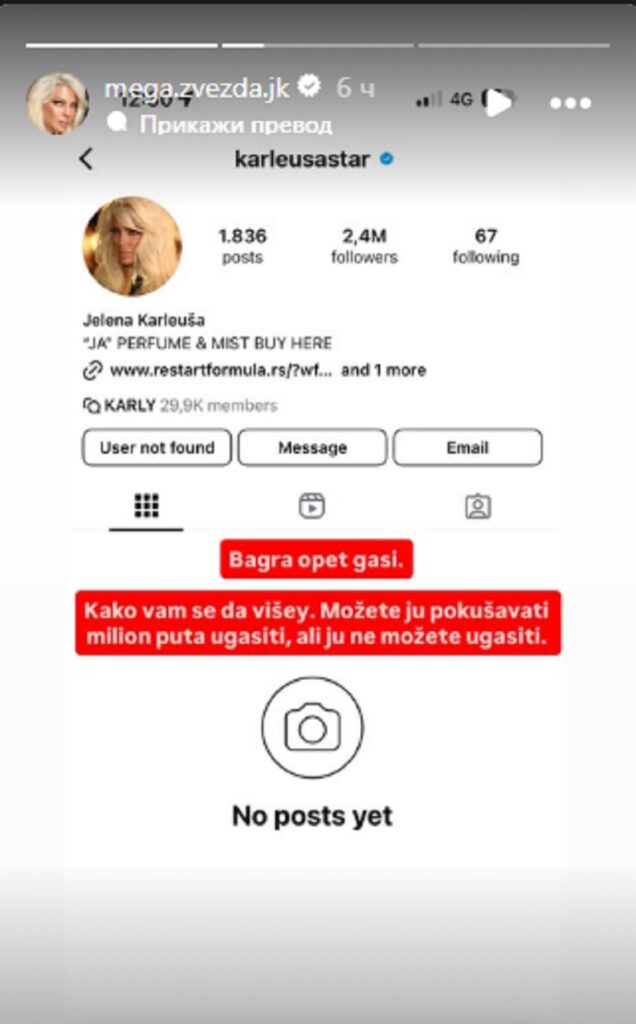 Međutim, kako se može videti pretragom Instagrama, njen zvanični nalok „karleusastar“ ponovo je suspendovan.