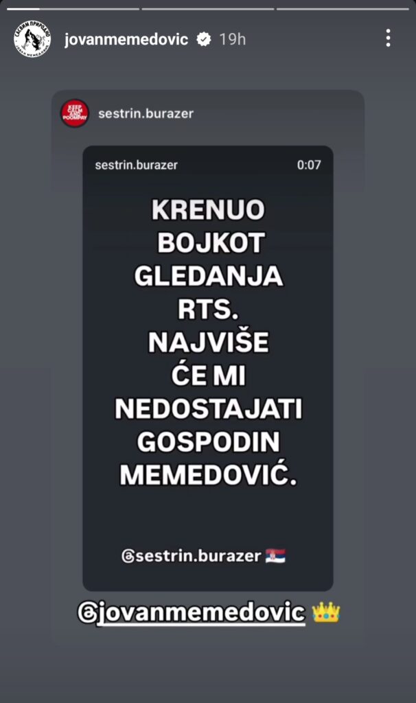 „Krenuo bojkot gledanja RTS. Najviše će mi nedostajati gospodin Memedović“, piše u objavi koju je voditelj podelio.