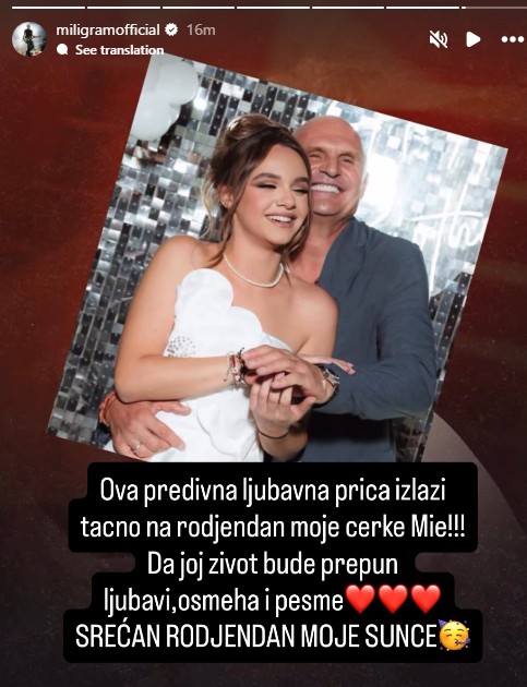 „Ova predivna ljubavna priča izlazi tačno na rođendan moje ćerke Mie. Da joj život bude prepun ljubavi, osmeha i pesme. Srećan rođendan, moje sunce“, napisao je Mili uz fotografiju sa naslednicom.