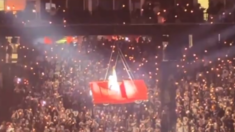 Članovi njenog tima su u međuvremenu isključili muziku i prigušili svetla kako bi pevačici pomogli da izađe iz lopte. Video-snimci prikazuju publiku dok skandira: „Napred, Kejti!“