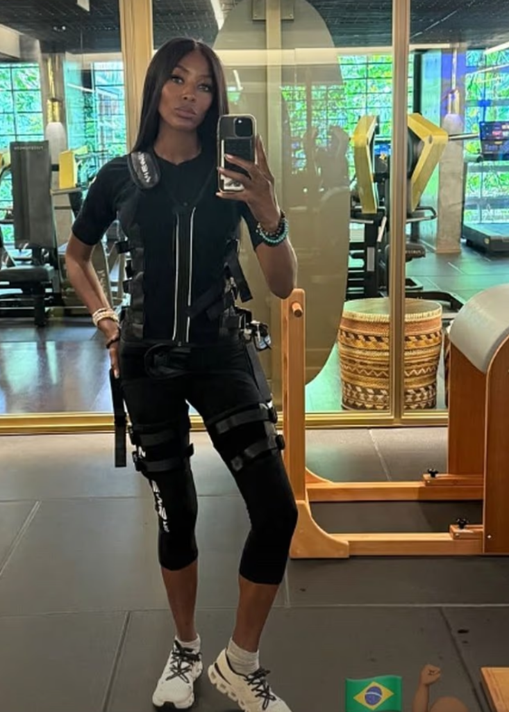 Naomi je nosila odelo za električnu stimulaciju mišića (EMS) tokom sesije reformer pilatesa i objavila video sa treninga na svom Instagram storiju.