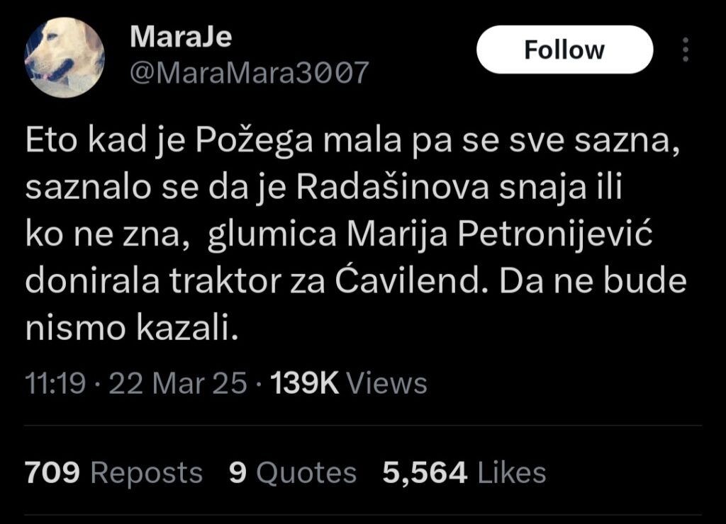 „Eto kad je Požega mala pa se sve sazna, saznalo se da je Radašinova snaja ili ko ne zna, glumica Marija Petronijević donirala traktor za Ćacilend. Da ne bude nismo kazali“, stoji u spornoj objavi koja je prikupila preko 5.000 lajkova.