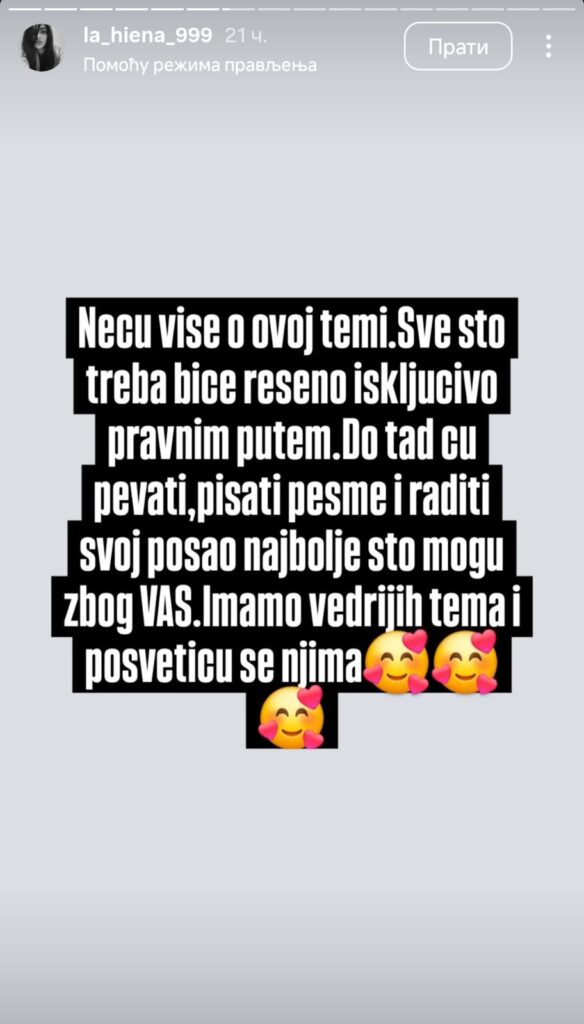 „Neću više o ovoj temi. Sve što treba biće rešeno isključivo pravnim putem. Do tada ću pevati, pisati pesme i raditi svoj posao najbolje što mogu zbog vas. Imamo vedrijih tema i posvetiću se njima“, napisala je ona za kraj.