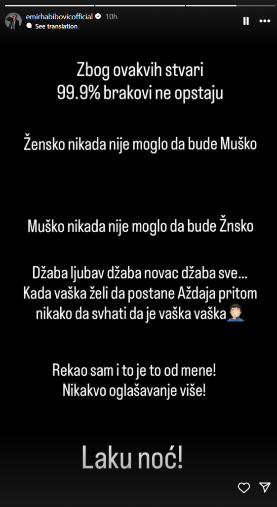 Pevač Emir Habibović otpratio svoju suprugu sa Instagrama, a onda objavio stori na temu razvoda.