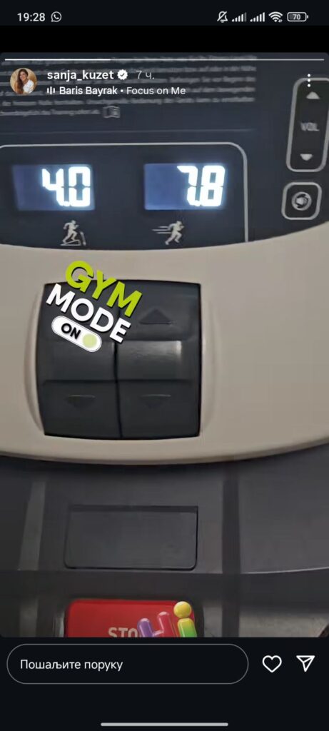Svoje pratioce na Instagramu redovno obaveštava kako trenira, a dok je ranije birala vežbe koje podrazumevaju snagu, poput kros fita, sada je pokazala da ima snage da trči na traci pod nagibom.