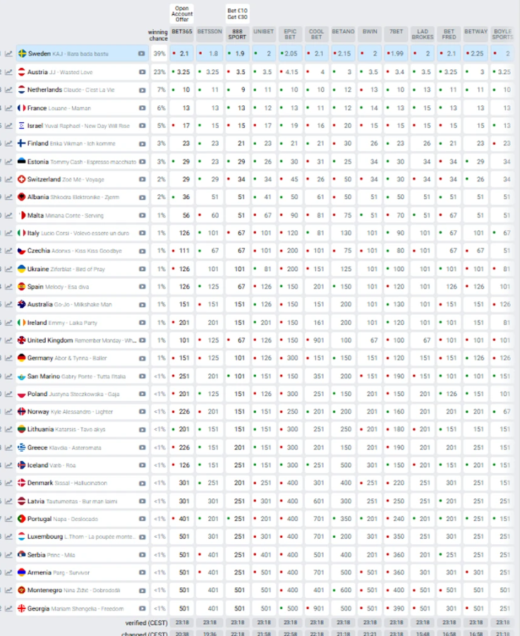 Kladionice pobedu na Evroviziji 2025 predviđaju Švedskoj, ali iako su im do sada predviđali 44% šanse za pobedu, taj procenat se smanjio na 39%.