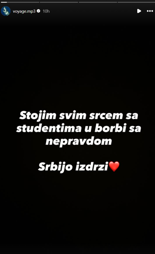 „Stojim svim srcem sa studentima u borbi sa nepravdom. Srbijo izdrži.“