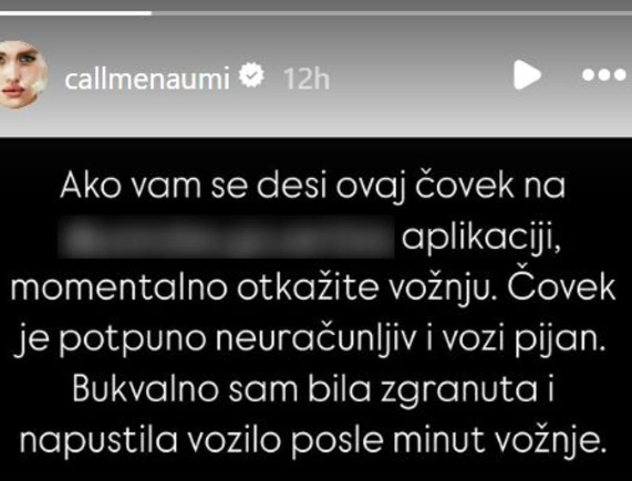 „Ako vam se desi ovaj čovek na aplikaciji, momentalno otkažite vožnju. Čovek je potpuno neuračunljiv i vozi pijan. Bukvalno sam bila zgranuta i napustila vozilo posle minut vožnje“, napisala je Mina na Instagramu.