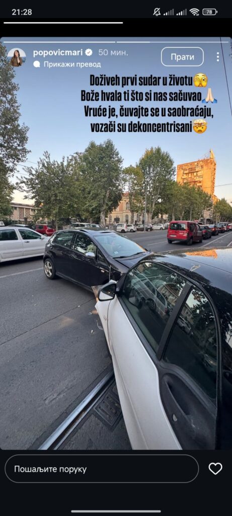 „Doživeh prvi sudar u životu. Bože, hvala ti što si nas sačuvao. Vruće je, čuvajte se u saobraćaju, vozači su dekoncentrisani“, napisala je voditeljka na svojoj društvenoj mreži.