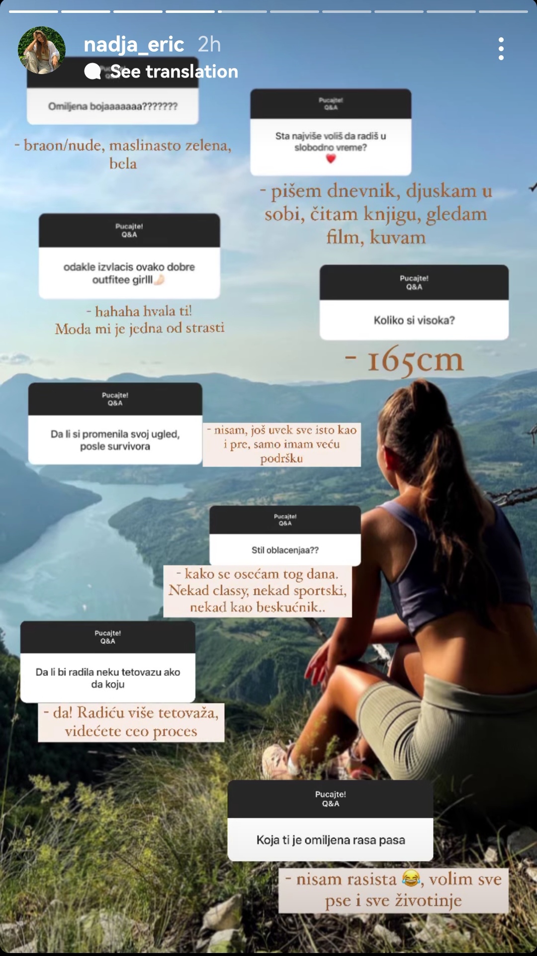 Nađa je ovom prilikom odgovarala i na pitanja koja nisu vezana za Survivor. Dotakla se mode, stila oblačenja, pa otkrila koliko je visoka, koja joj je omiljena boja, kao i da planira da uradi nekoliko tetovaža.