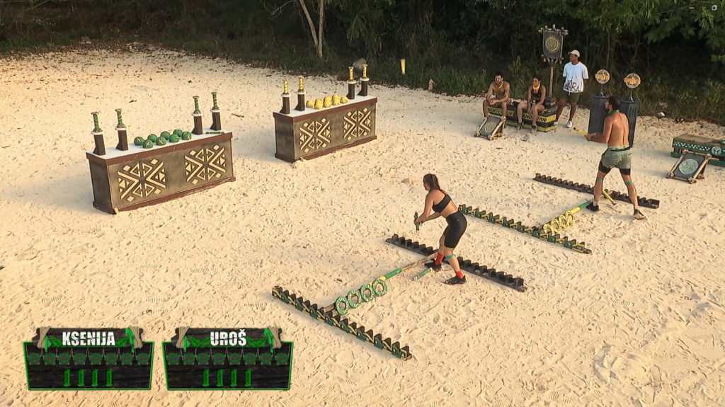 „Zeleni i žuti, i dalje se borite unutar svog plemena. Svako od vas započinje borbu sa četiri života. Borite se dok dva takmičara ne ostanu bez života, što znači da je dovoljno da jednom ostane jedan život i taj jedan život će ga dovesti u finale, a preostala dva takmičara će ići u duel“, rekao je voditelj.